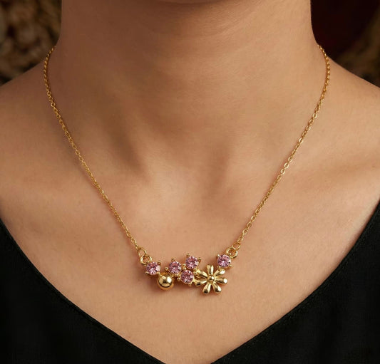 Floral Crystal Bar Necklace - Gold Plated Pink Crystal Charm