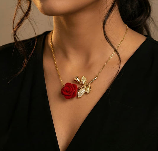 Red Rose Necklace - Gold Plated Crystal Stem Pendant