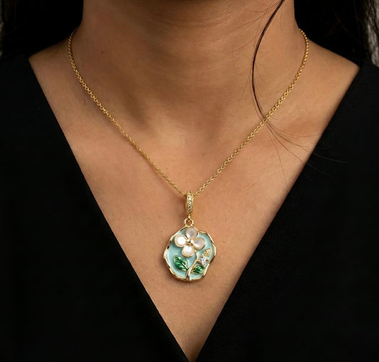 Floral Pearl Pendant Necklace - Gold Plated Enamel Garden Design