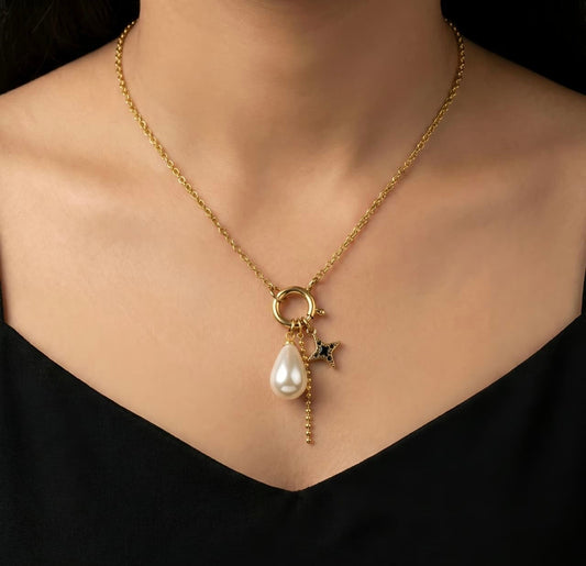 Pearl Star Charm Necklace - Gold Plated Multi-Charm Pendant